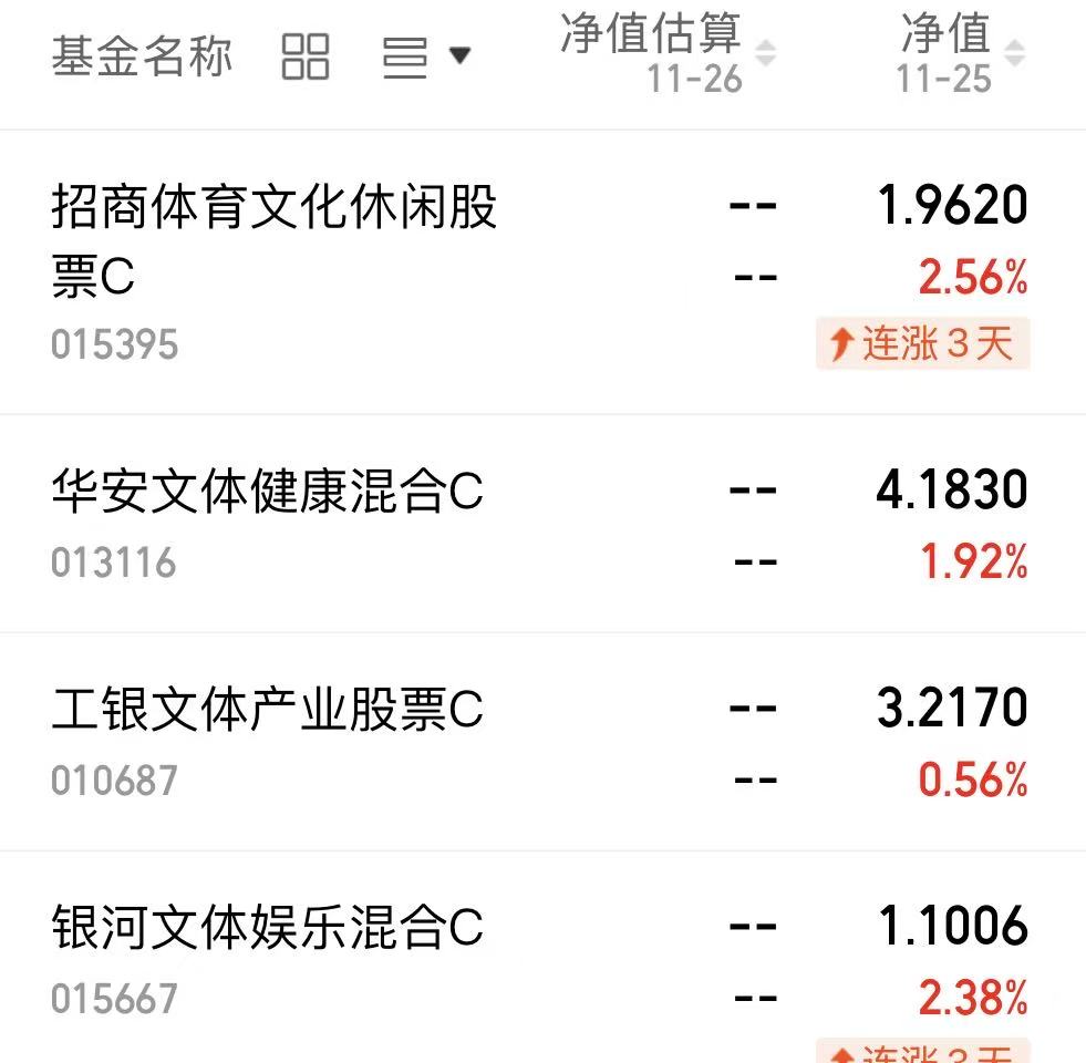 今天A股延续反弹回暖啦,三大指数涨幅不错,行情终于要修复起来了,各大板块都是吃肉为主,文化体育娱乐方向连续上涨,$招商体育文化休闲股票C(OTCFUND|015395)$昨天上涨2.56%,表现不错呢!