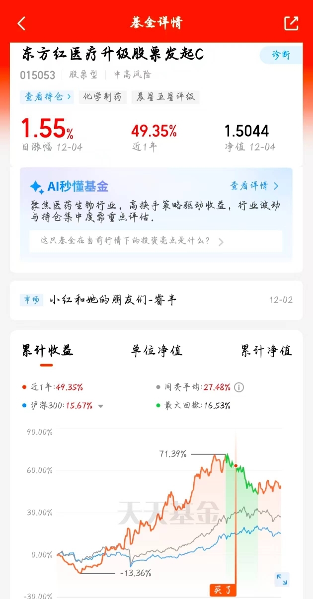 昨天东方红医疗升级股票发起C上涨1.55%,半年收益达到8.26%,这样的持续增长确实让人安心。