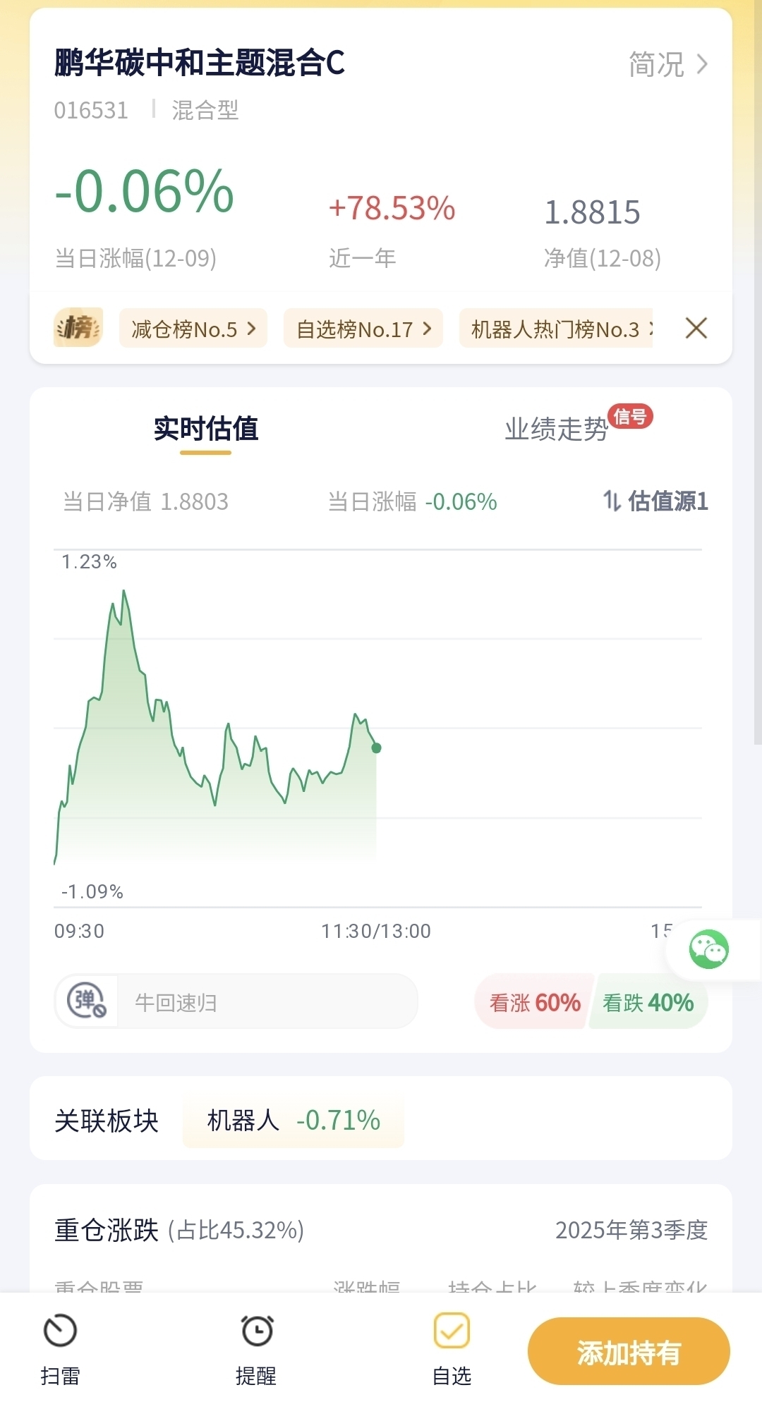 鹏华碳中和主题混合C今日预估跌幅0.06%!
