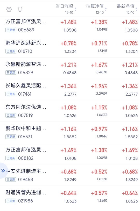 我这人不太信嘴上说的,就看能不能真做出来。最近刷到不少机器人测试视频和合作消息,感觉确实在往前走。我就每周定投一点,不多,就当长期盯着看。今天账户涨了点,挺开心,但更想看到明年真能量产。$鹏华碳中和主题混合C$ 上涨了1.16%,$方正富邦信泓混合C$ 上涨了1.48%,$平安先进制造主题股票发起C$