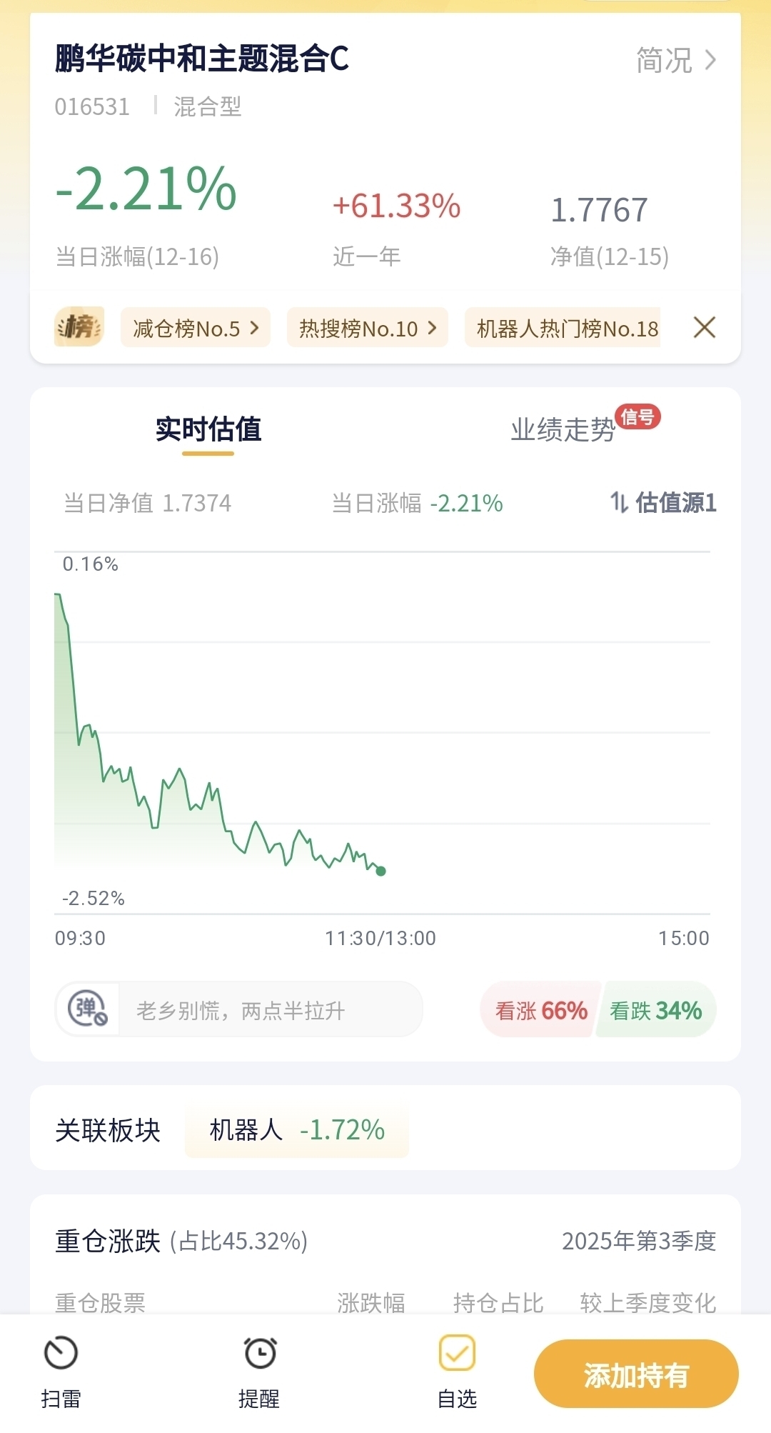 鹏华碳中和主题混合C今日预估跌幅2.21%!