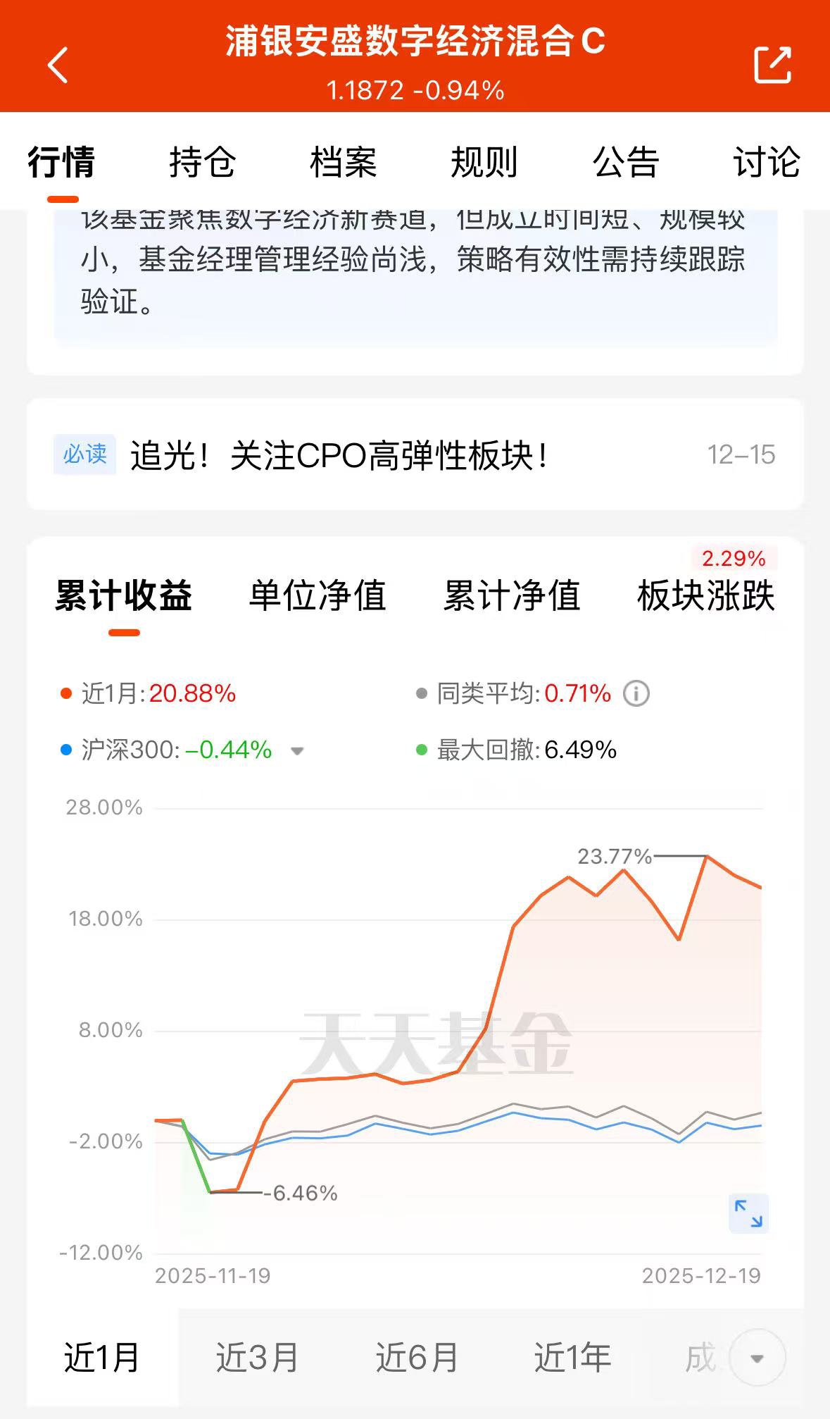 还是跌不下去啊,调整后总还能反弹回来,看好CPO就买弹性足的浦银安盛数字经济,近一月大涨20%,全市场cpo竞品第$浦银安盛数字经济混合C$