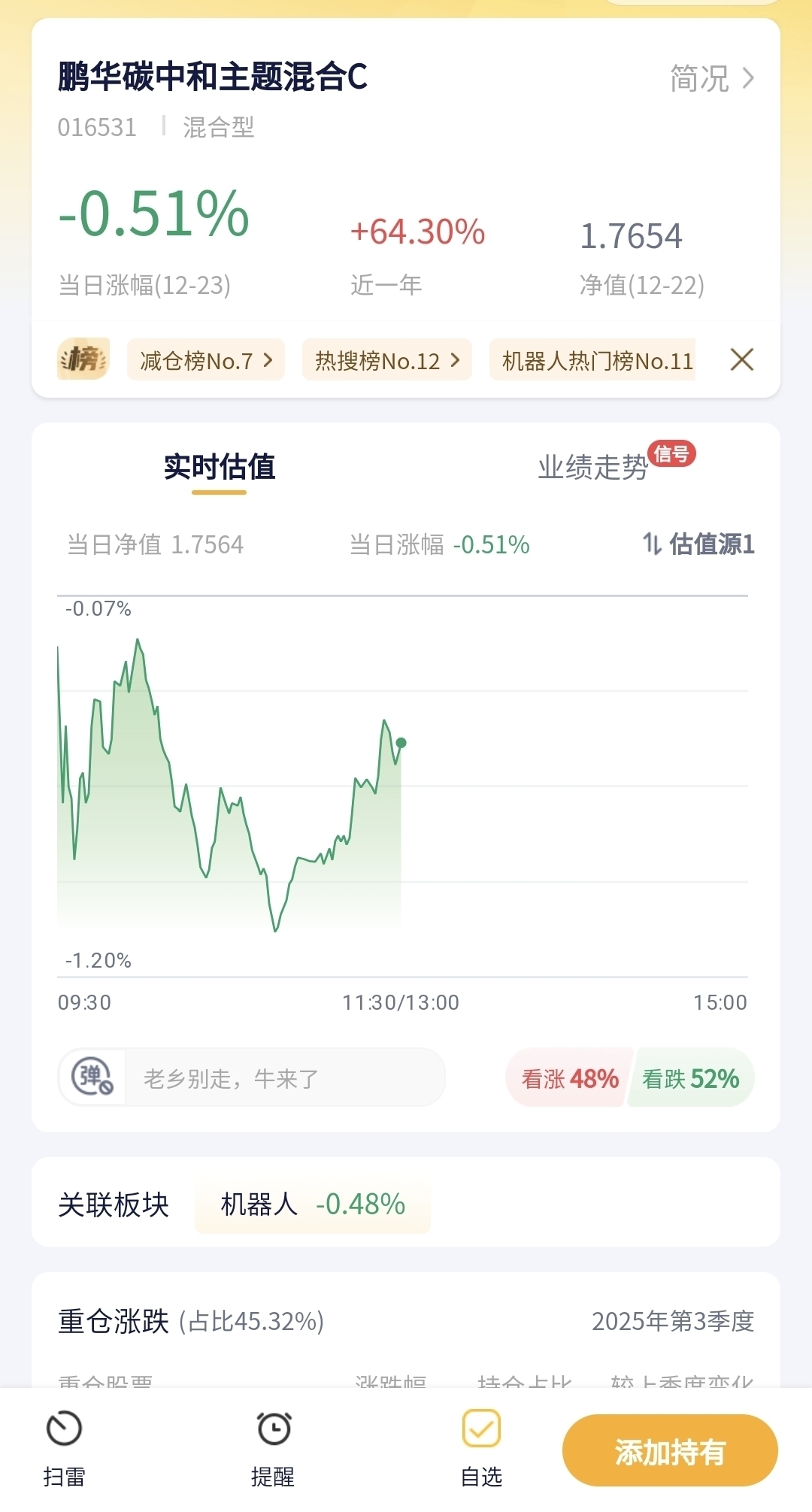 鹏华碳中和主题混合C今日预估跌幅0.51%