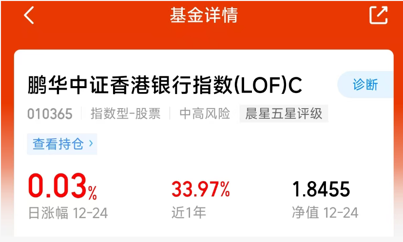 面对近期的市场震荡,我选择将部分资金投入$鹏华香港银行指数(LOF)C$(010365)。观察板块间的表现差异,银行板块近期的走势相对独立,波动幅度明显小于其他一些板块。这只产品通过投资香港银行指数,间接持有了一篮子香港本地的主要银行,这些银行通常具备稳定的经营特征。在当前阶段,这类配置思路或许有助于应对市场的短期波动。如果你对目前行情感到犹豫,不妨也考虑一下这个选择。#【跨年坦白局】提问金梓才、陈果#