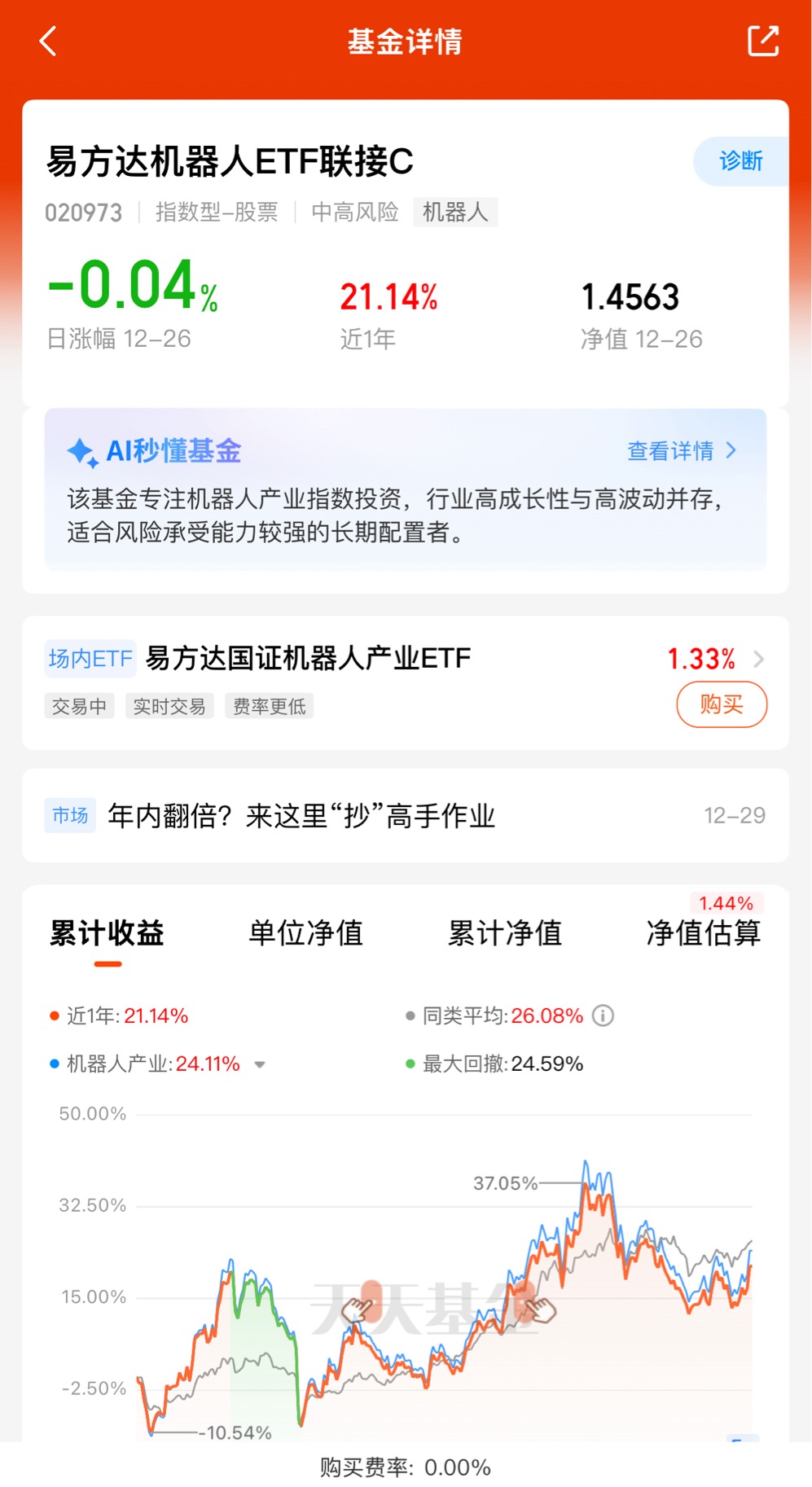 易方达机器人ETF联接C目前涨幅约1.44%!