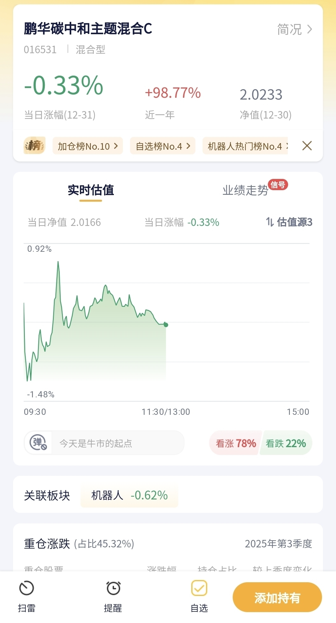 鹏华碳中和主题混合C今日预估跌幅0.33%!