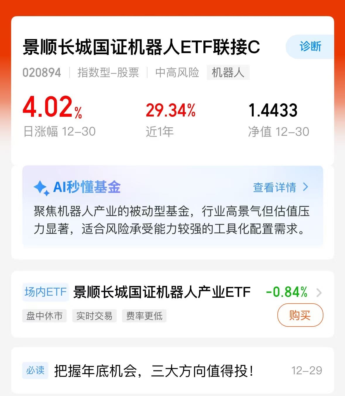 #挖掘超额收益# 机器人这波反弹牛啊,感觉热度又回来了,国证机器人比中证好点,国证昨天涨4%,中证3%,买指数就买国证,特别景顺国证机器人还是7免指数$景顺长城国证机器人ETF联接C$