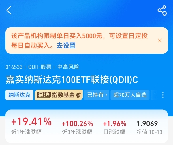 我的$嘉实纳斯达克100ETF发起联接(QDII)C人民币$ 作为紧密跟踪纳斯达克100指数的工具,表现可圈可点——近一年净值上涨超19%,而纳斯达克指数本身已实现多年连续上涨,稳定性凸显。从长期逻辑看,科技领域始终是全球创新的核心引擎,AI、云计算等前沿技术的持续突破,为板块打开了广阔成长空间,这一方向依然值得坚定看好。更值得关注的是,现在这个5000元的申购额度限制,继续格局等待吃肉了!
