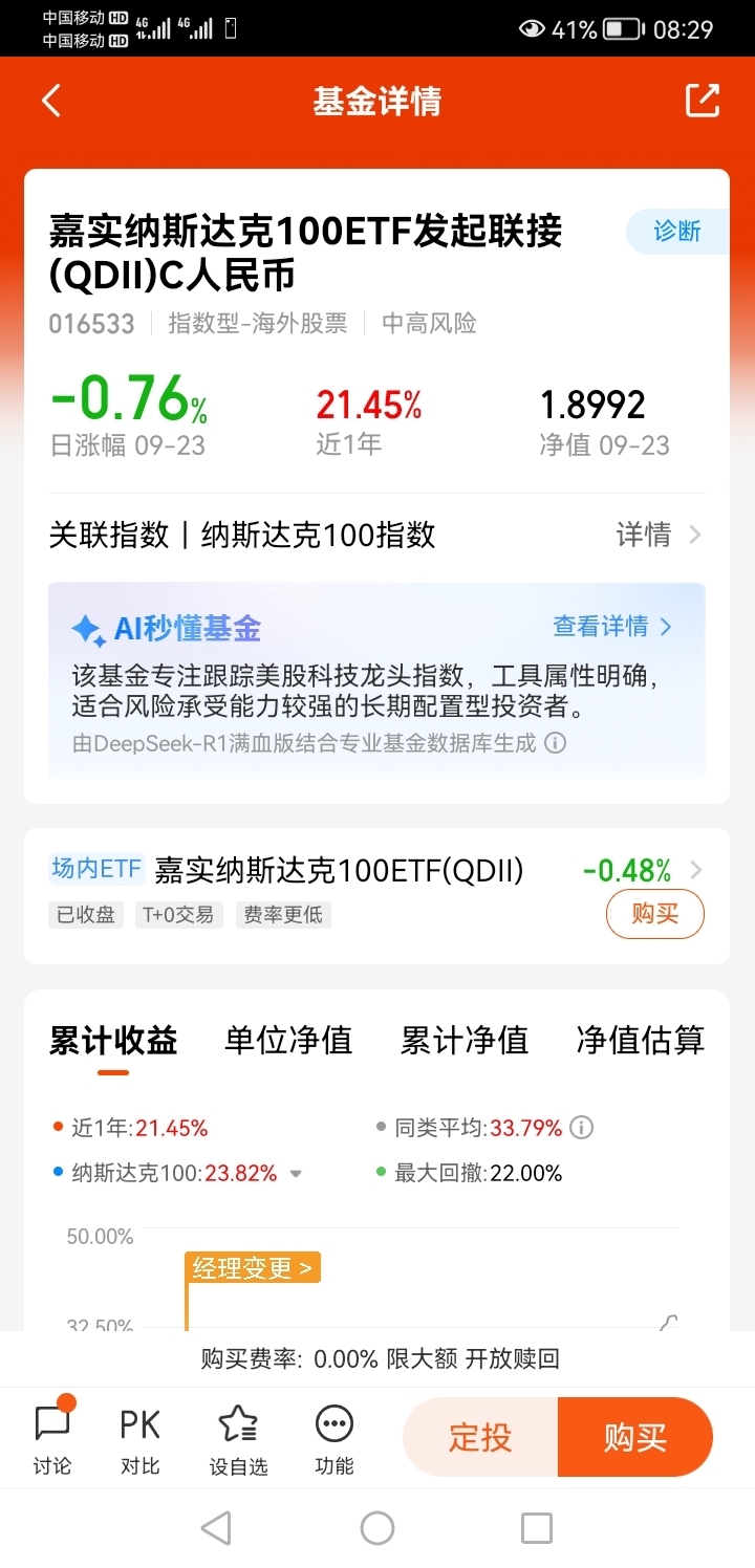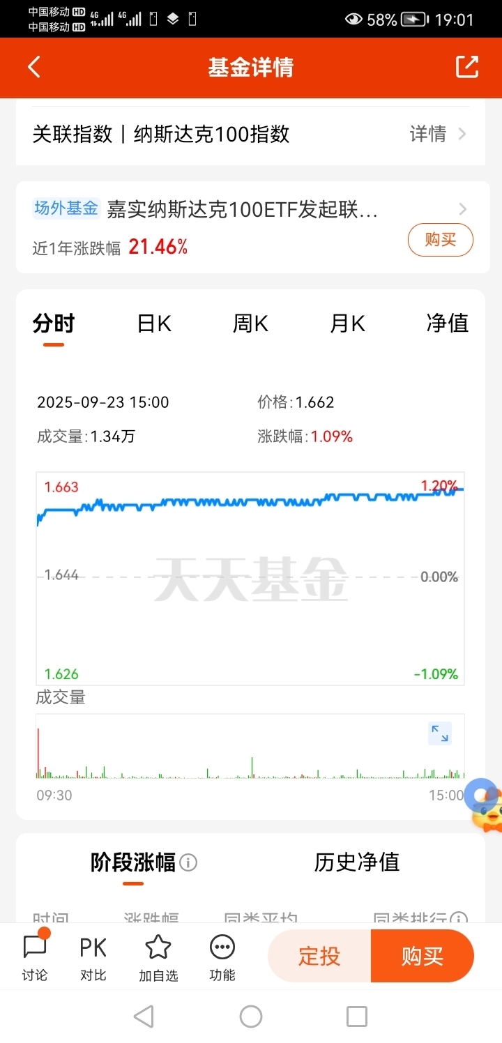9.23日美国纳斯达克涨,0.55,场内涨了1.09.为啥当天的基金是跌了0.76呢?