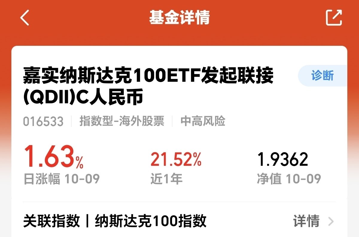 而我关注的$嘉实纳斯达克100ETF发起联接(QDII)C人民币$ ,它表现极为出色,近一年收涨21.52%,超额收益显著,且它支持T+0交易,短期可以很好的把握波动机会,我继续看好!