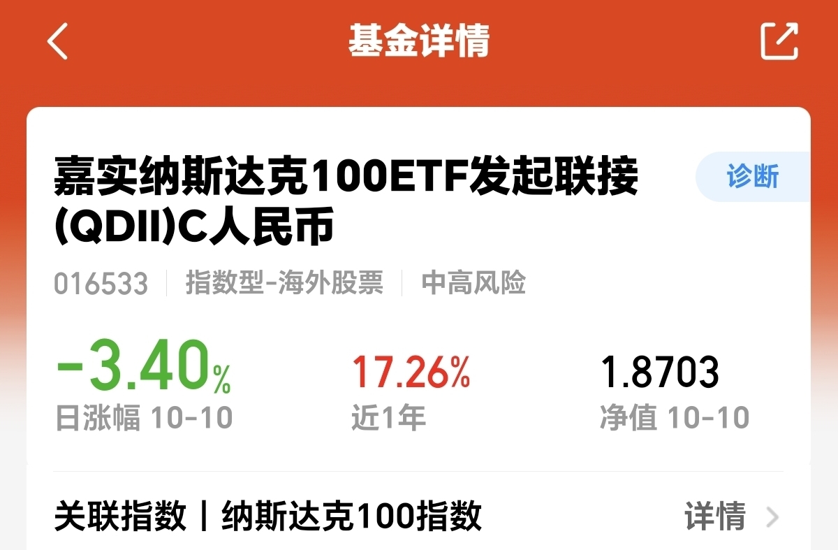 宝子们我关注的$嘉实纳斯达克100ETF发起联接(QDII)C人民币$它直接跟踪