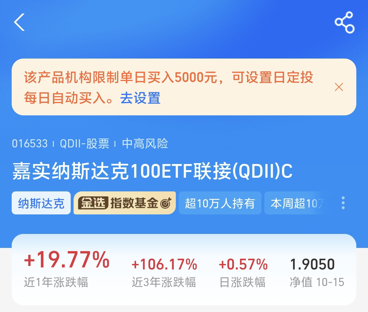 $嘉实纳斯达克100ETF发起联接(QDII)C人民币$ 基金近期表现的也是非常的优秀,今天晚上当日上涨了0.57%,近六个月上涨了26.98%,盈利能力强。各阶段业绩在同类基金排名领先,收益率远超同类平均。基金精准的跟踪纳斯达克100指数,综合费率低。其中成分股为各领域的龙头企业,包含了苹果、微软、英伟达、特斯拉等科技龙头,基金上涨弹性大,爆发力强。随着人工智能、云计算、半导体等技术的不断突破和应用拓展,企业业绩逐步上升,将带动纳斯达克指数上涨。长期持有,投资回报率高,期待后期收益,坐等吃肉!