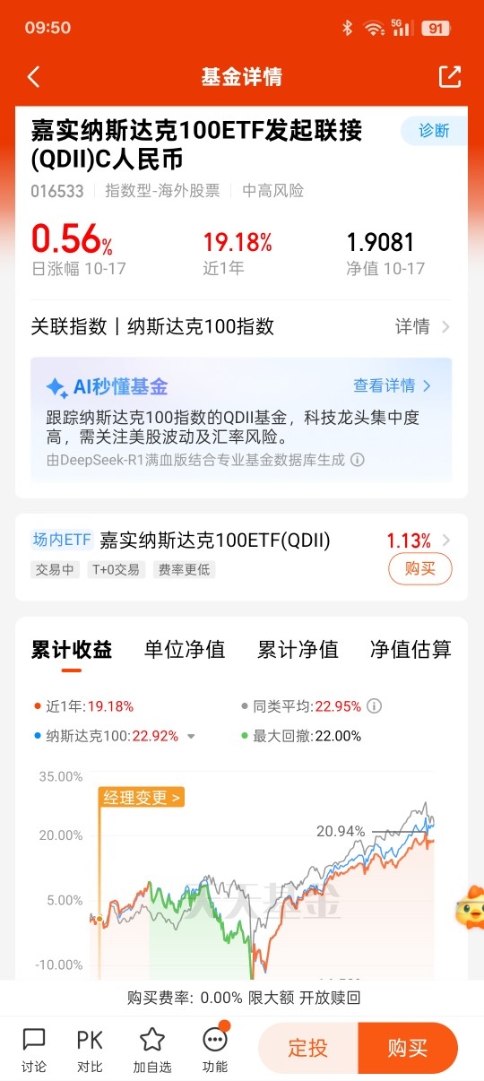 近期美股市场迎来普涨行情,三大指数全线收高,纳斯达克指数上涨1.37%,道琼斯工业平均指数上涨1.12%,标普500指数上涨1.07%。我关注到的$嘉实纳斯达克100ETF发起联接(QDII)C人民币$ 又要美美吃肉了,这只产品紧密跟踪纳斯达克100指数,覆盖苹果、微软等全球科技巨头,近一年涨幅19.18%表现不错,近两天美股都有在涨,有望延续上涨姿态,搬好小板凳持续关注了。