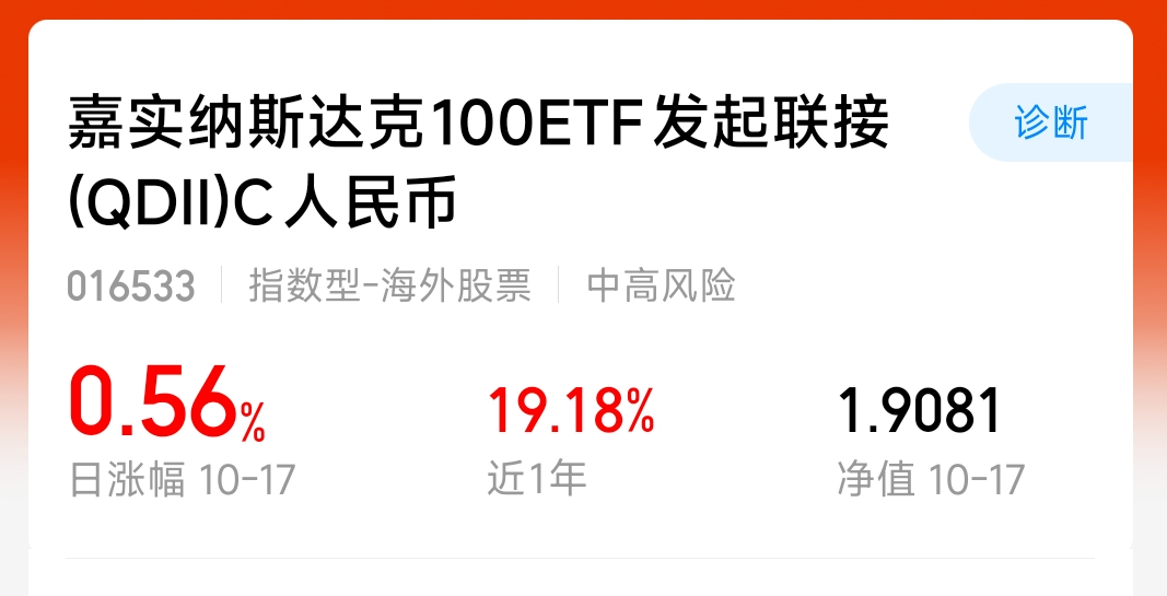 $嘉实纳斯达克100ETF发起联接(QDII)C人民币$ 紧密跟踪纳斯达克100指数,今天晚上更新继续吃肉啊 里面涵盖一些英伟达,博通还有苹果都是当下科技热门的方向,美股今年经历4.7号的时候也开始修复了,我相信后面还会继续新高呢,等待一波吧!这个近一年上涨了19个点,最大额度5000呢!