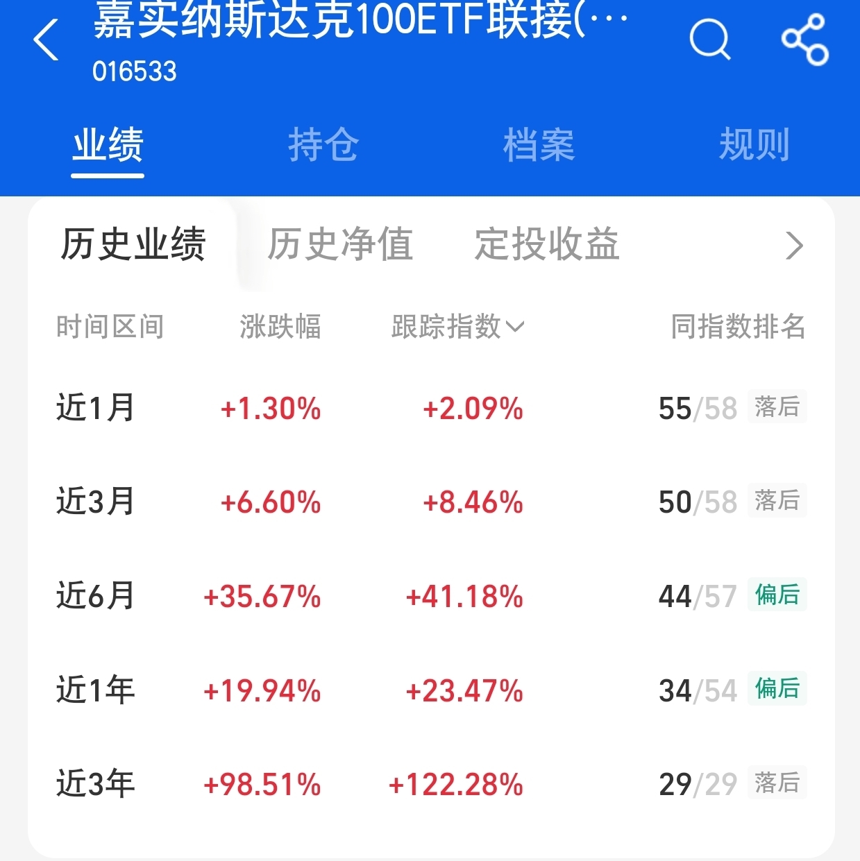 今早凌晨收盘纳指又回调了,最近震荡比较频繁,不过调整就意味着又可以加仓了,$嘉实纳斯达克100ETF发起联接(QDII)C人民币$ 目前全市场额度最高,每天可以买5000元,真的非常友好了。而且跟踪指数也比较准确,近一个月涨了1.30%,近6个月涨了35.67%,近一年涨了19.94%,接下来补仓和定投可以直接选这个了。