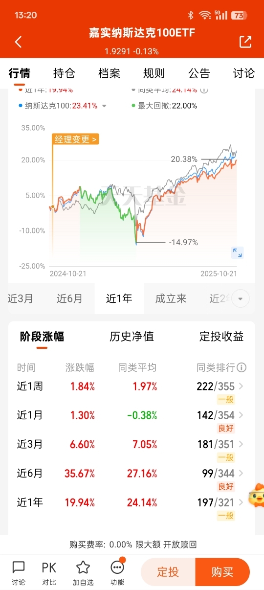 这两天美股市场迎来回调,昨日纳斯达克100指数下跌0.99%,主要是因为中美贸易紧张局势升级和部分企业财报不及预期导致的结果。我关注的$嘉实纳斯达克100ETF发起联接(QDII)C人民币$ 昨日小跌0.13%近一年涨幅19.94%,不过回调就是机会,从长远来看支持全球科技股上的逻辑依然存在,这个产品日限额5000算是市场限额最大的了,还有七免费率也低,操作起来灵活,趁着回调时机可以分批定投入局。