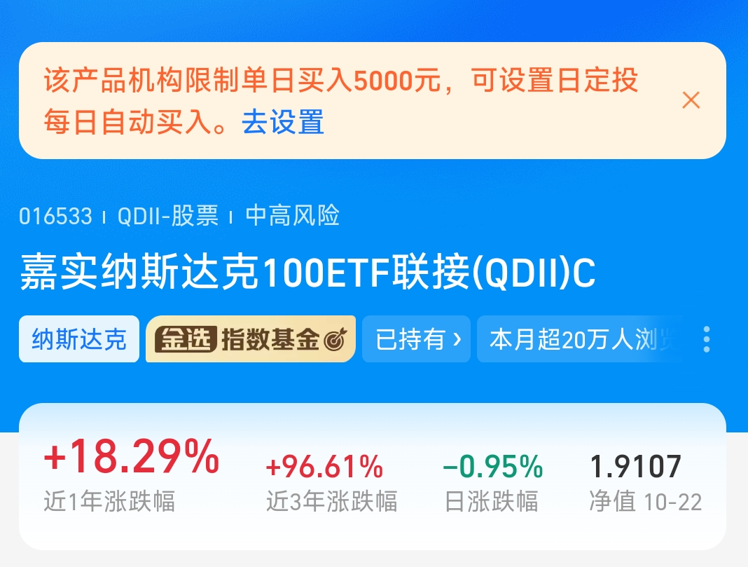 期中纳斯达克100涨0.01%,期待睡一觉起来期待又可以收红吧,$嘉实纳斯达克100ETF发起联接(QDII)C人民币$ 目前这个纳斯达克最大额度是5000,市场最大的一直呢,也是跟踪纳斯达克100走,长期来说美股年化率为15左右,已经连续上涨了很多年了,我相信后续继续上涨吧,他持仓一些公司都是具有稳定上涨的,还有今年两次降息为一些美国企业释放流动性。为这个市场有所支撑!