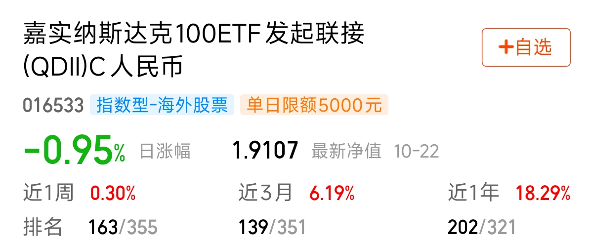 还是美股强势,夜盘这个没有利空的消息阻挡下,又继续飙升了$嘉实纳斯达克100ETF发起联接(QDII)C人民币$ 跟踪纳斯达克100走,目前这个最大额度是5000呢,市场最高的一个,今天大a这这边也是不错的上涨,科技的方向全速回归了,纳斯达克长期上涨,里面一些英伟达,还有一些苹果的财报都是盈利的,对一些科技方向形成利好,我觉得后续还是有科技的,等待后续继续上涨,看你新高了