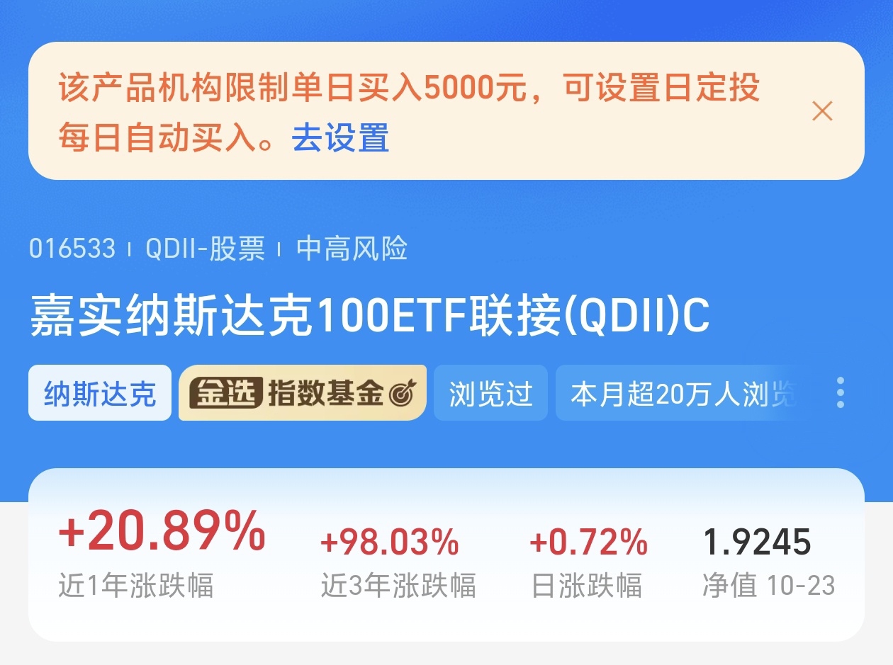 $嘉实纳斯达克100ETF发起联接(QDII)C人民币$ 基金表现的也是非常的优秀,今天晚上单日上涨了0.72%,近三个月上涨了6.59%,近六个月上涨了29.14%,收益率高。基金成分股涵盖了苹果,微软,英伟达,亚马逊等全球科技龙头企业。在各自的领域占据主导地位,技术壁垒高,拥有强大的研发实力和市场竞争力。随着成份股公司在AI、云计算、量子计算等前沿占据主导地位,企业营收能力也逐步的上涨。未来增长潜力巨大,长期持有,投资回报率高,期待后期收益。