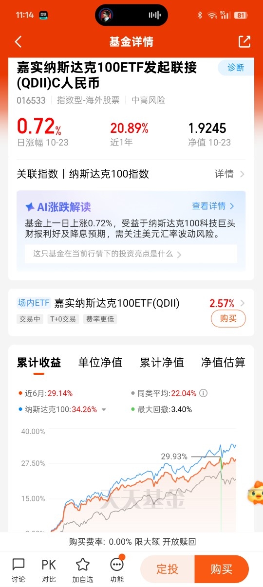 近期美股三大指数接连创下历史新高,科技股表现强力,主要受益于人工智能相关股票的强劲表现推动,纳斯达克100指数上周累计上涨2.18%,科技板块在市场处于领先位置。$嘉实纳斯达克100ETF发起联接(QDII)C人民币$ 单日额度5000市场最高,它聚焦的就是纳斯达克100指数,覆盖苹果、微软这些美股科技龙头企业,近六个月涨幅29.14%业绩表现不错,在当前科技股持续走强的形势下值得期待。
