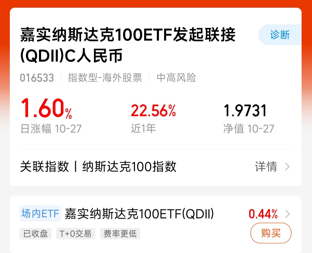在全球科技浪潮和美联储政策转向的双重推动下,美股市场持续向好。近日主要指数全线走高,以科技股为主的纳斯达克指数涨势尤为强劲,彰显科技板块的领涨实力。作为布局美股科技行情的高效工具,$嘉实纳斯达克100ETF发起联接(QDII)C人民币$ 紧密跟踪纳斯达克100指数,重仓持有苹果、微软、英伟达、亚马逊等全球知名科技巨头。从业绩表现来看,该基金昨日实现1.6%的涨幅,近一年累计收益达到22.56%,展现出稳健的盈利能力。随着科技创新持续推进和流动性环境改善的背景下,纳斯达克100指数有望延续良好表现。该基金提供了一键配置全球科技产业的机会,持续看好。