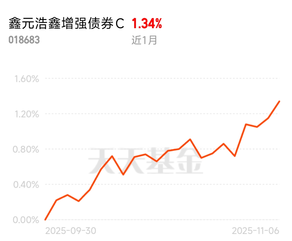 现在大家理财都求稳不求险,增强债基因为平衡风险和收益备受青睐。鑫元浩鑫增强债券C没让人失望,近一个月收益1.34%,操作风格稳健不冒进,不管市场怎么变,都能守住收益基本盘。