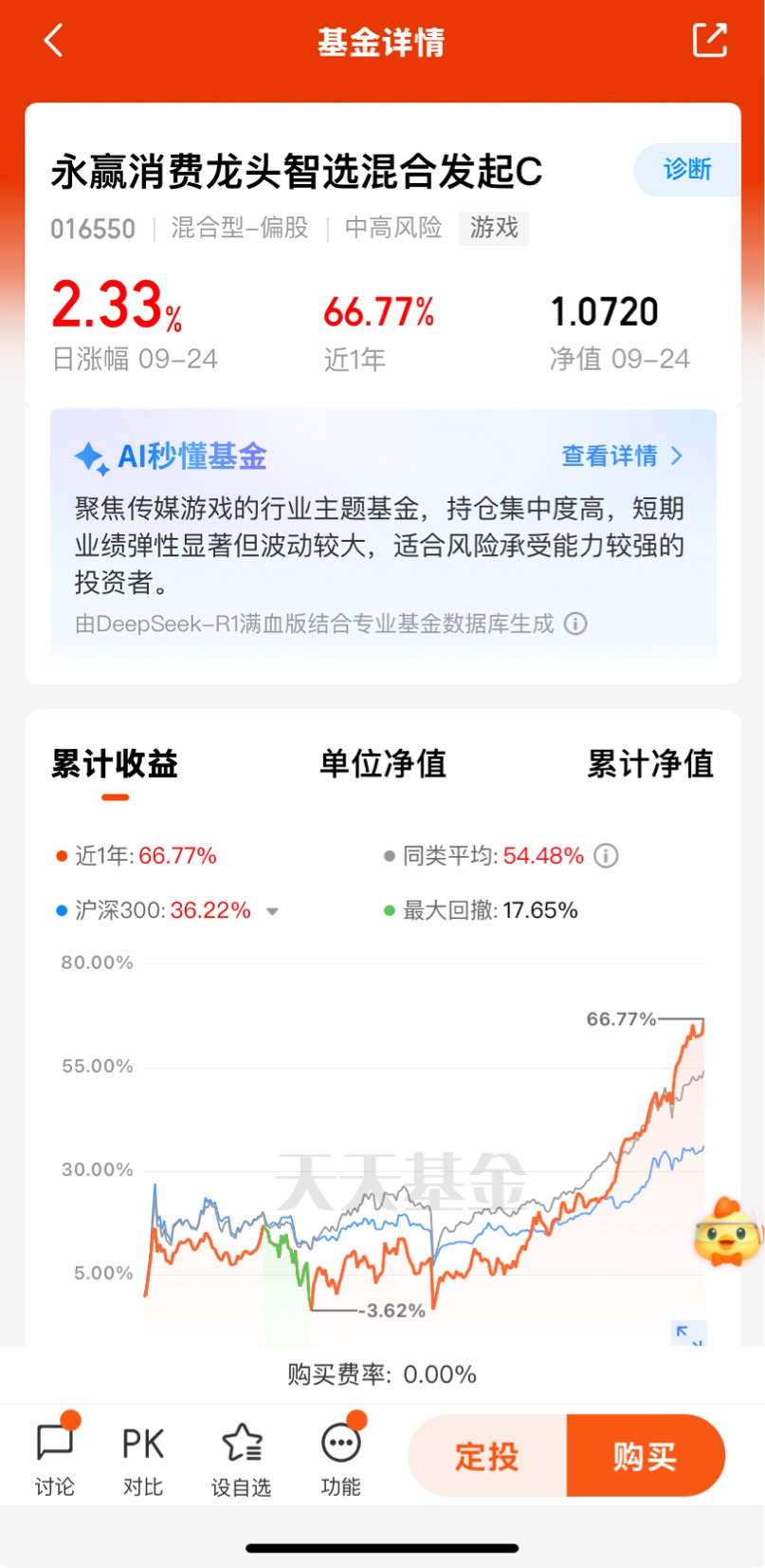 #股神巴菲特清仓比亚迪,大家怎么看?# 消费升级仍是主线,国货品牌、数字消费、健康消费、情绪消费等新兴领域有望持续增长;传统消费(如白酒、家电)在经济复苏和行业集中度提升的背景下,有望逐步企稳回升。$永赢消费龙头智选混合发起C$ 昨天上涨2.33%,近一个月收益13.84%,近三个月收益41.44%,近一年收益66.77%;各阶段业绩都不错;政府将提振消费列为重要任务,政策力度持续加码,涵盖消费补贴、税收优惠、服务消费扩容等,为板块复苏提供政策保障。