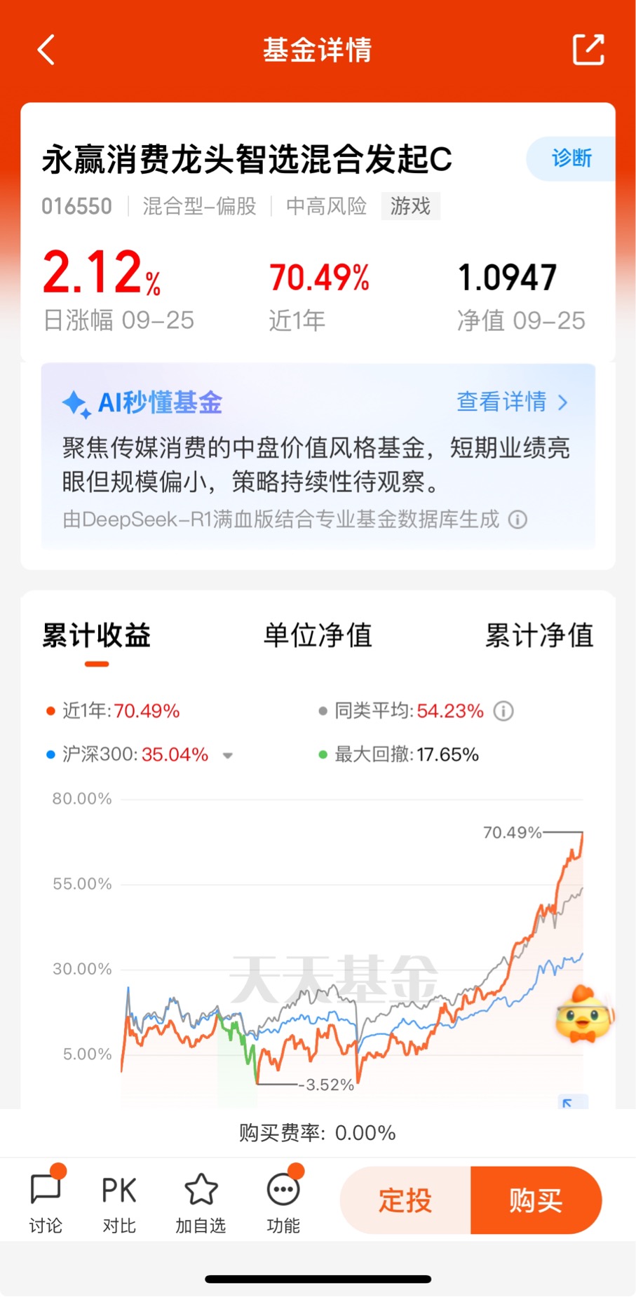 $永赢消费龙头智选混合发起C$ 昨天收2.12%,近一个月收15.27%,近3个月收43.79%,近6个月收61.94%,近一年收70.49%,表现优秀!敏锐把握近期市场机遇,精准布局游戏板块。从产品设计来看,该基金一直专注于挖掘AI+传媒企业投资价值,并充分发挥主动管理优势进行灵活选股!