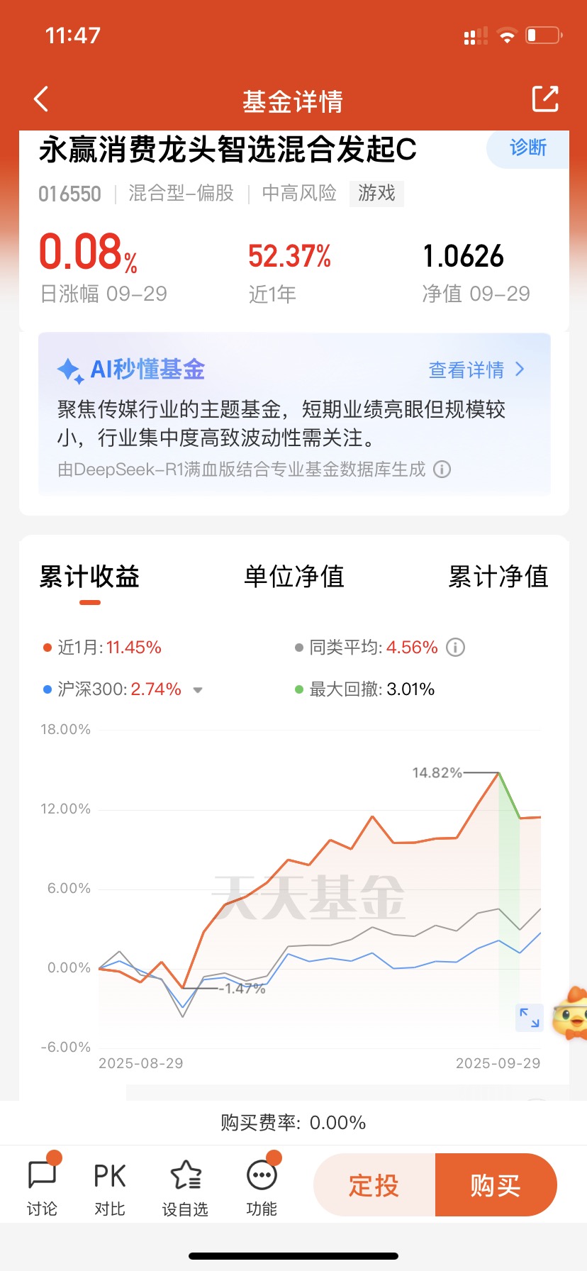 $永赢消费龙头智选混合发起C$ 昨天涨了0.08%,七天六涨啊,状态给力啊!这里是聚焦传媒行业的主题基金, 聚焦传媒与泛消费的中盘混合型基金,行业集中度高,近三个月39.87%涨幅,近半年52.98%涨幅,业绩稳健,波动小,回撤低,目前赛道正处于高速发展阶段,值得期待了!#“924行情”一周年 你赚了多少?#