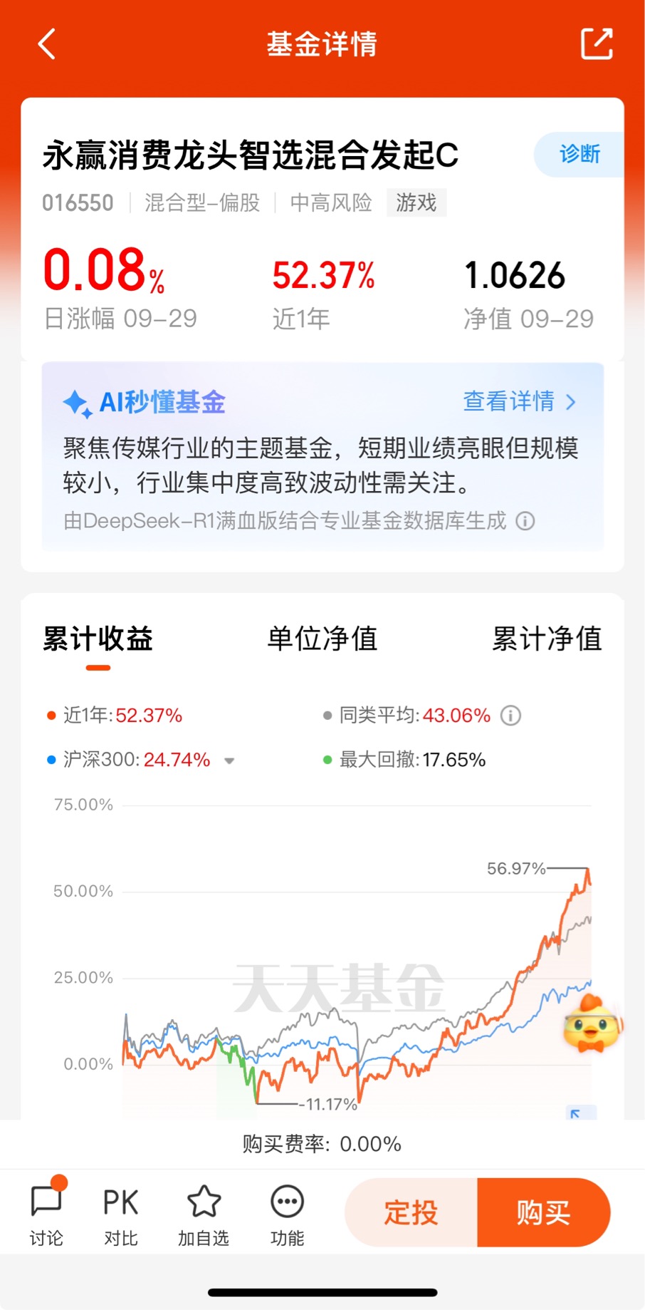 $永赢消费龙头智选混合发起C$ 昨天收0.08%,近一个月收11.45%,近3个月收39.87%,近6个月收52.98%,表现优秀!该基金聚焦传媒和游戏等细分消费领域,这两大板块的特点是深度受益于AI产业发展,消费板块目前的性价比是非常高的!基金持仓结构灵活调整,在游戏行业高景气度背景下,精准布局优质个股,成为投资者分享行业红利的优质工具。