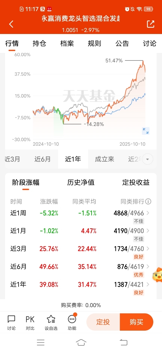 $永赢消费龙头智选混合发起C$趁着市场回调也是时机,提前埋伏一波,近三个月涨幅2