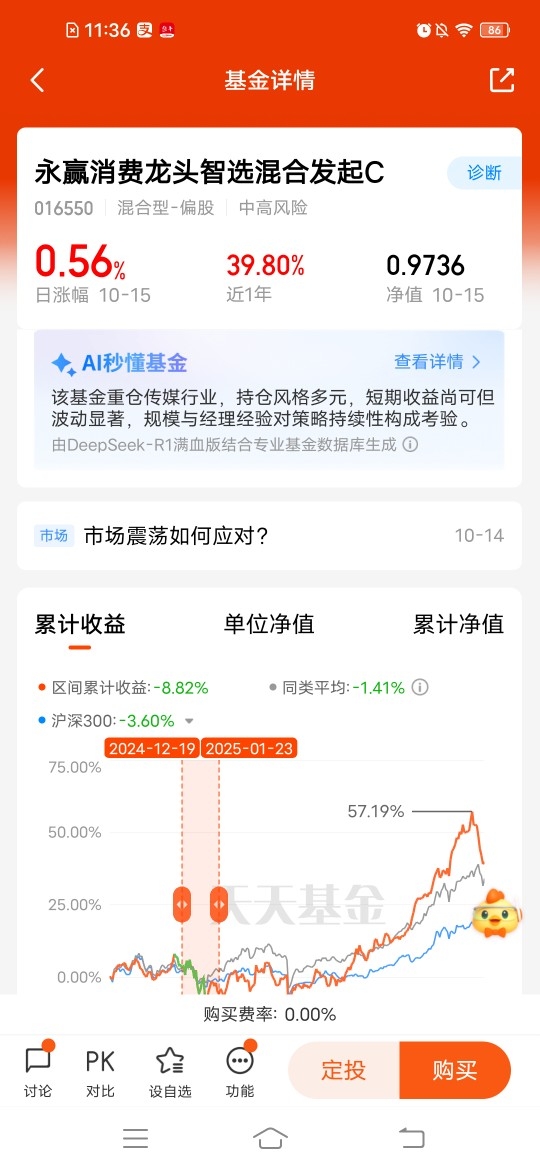 $永赢消费龙头智选混合发起C$调整后也是时机, 昨天涨幅0.56%,近三个月涨幅24.61%,近六个月涨幅43.20%,近一年涨幅39.80%,各个阶段业绩稳定,行业估值处于历史低位。该基金聚焦传媒+教育双主线,基金经理通过精选高景气细分赛道,兼顾消费复苏与科技赋能,中长期更值得期待。#分享国庆见闻,晒收益,瓜分好礼!#