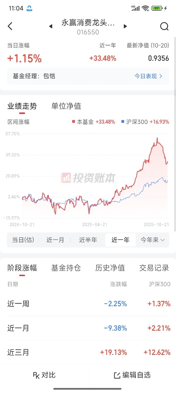 趁着消费刚企稳回升现在涨的不多,小买1000永赢消费龙头智选混合发起C016550,今天估值上涨1.15%,近三个月收益率18.45%,近一年收益率31.90%,这只主投传媒+应用,持仓有A股+港股,经理经历过多轮牛熊,能力值得放心。
