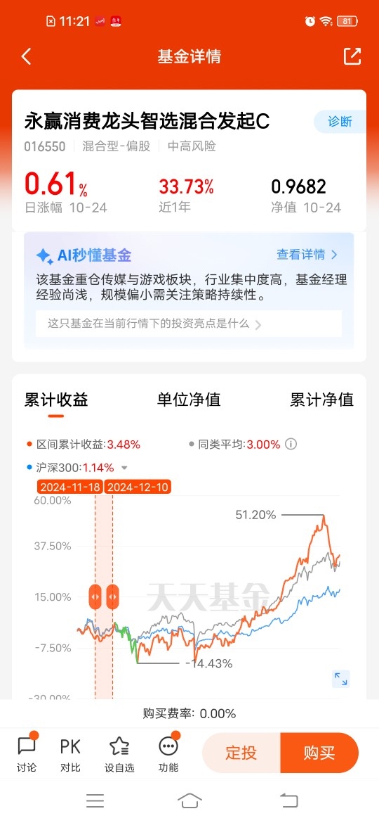 $永赢消费龙头智选混合发起C$ 近一周涨幅4.19%,近三个月涨幅21.77%,近六个月涨幅44.49%,近一年涨幅33.73%,各个阶段业绩稳定,行业估值处于历史低位。该基金聚焦传媒+教育双主线,基金经理通过精选高景气细分赛道,兼顾消费复苏与科技赋能,中长期还是值得期待的。#宁德时代Q3净利润185.5亿元!如何解读?#