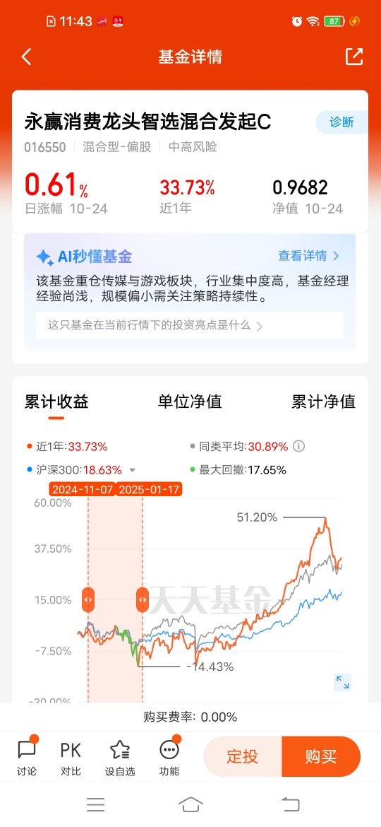 $永赢消费龙头智选混合发起C$ 有波动就有机会,聚焦AI教育与传媒。现在估值偏低,投资性价比高。近一周涨幅4.19%,近三个月涨幅21.77%,近一年涨幅33.73%,AI科技发展,教育和传媒受益不错。将助力传媒行业重铸辉煌,传媒行业加速发展,政策利好共振下,布局高景气高成长赛道,值得期待。#10月你看好哪些投资赛道?#