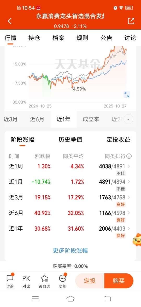 $永赢消费龙头智选混合发起C$ 趋势向好,趁着波动收集点筹码,近一周涨幅1.30%,近三个月涨幅19.15%,近六个月涨幅40.92%,近一年涨幅30.68%,各个阶段业绩稳定,行业估值处于历史低位。该基金聚焦传媒+教育双主线,基金经理通过精选高景气细分赛道,兼顾消费复苏与科技赋能,中长期更值得期待。#慢慢投基路 你悟出了哪些投资哲学?#