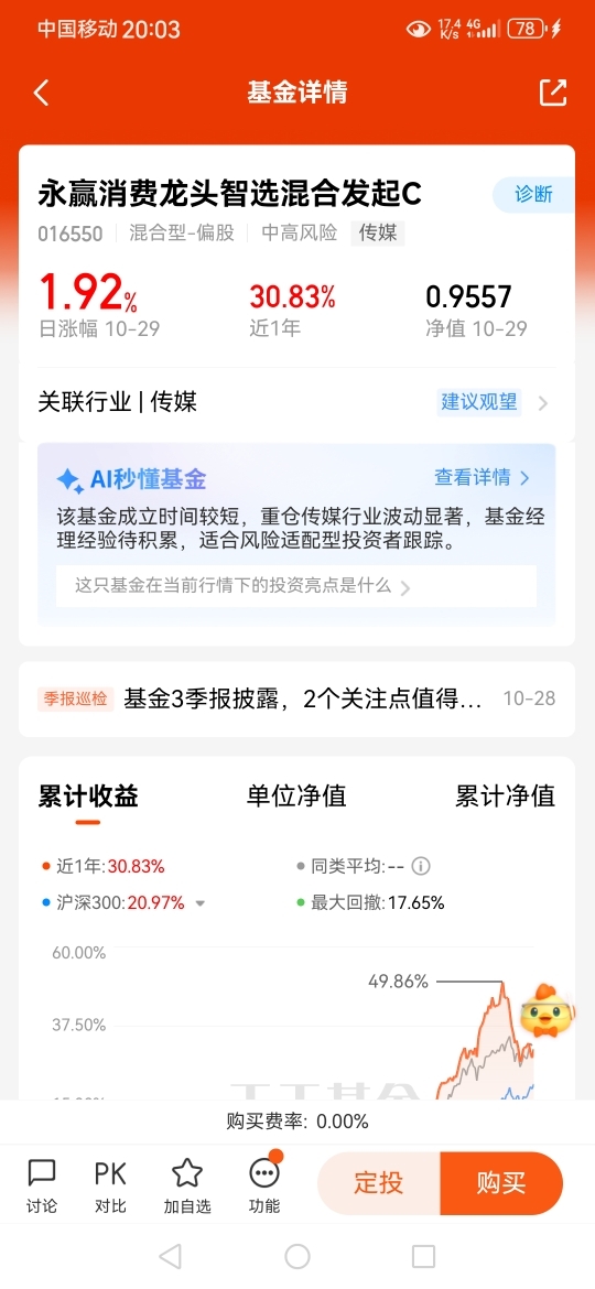 #10月基金投资策略# 消费作为经济"稳定器",需求刚性特征明显,尤其食品饮料、医药等必选消费板块,在经济波动中更具抗风险能力,适合追求稳健收益的投资者,一起来看看$永赢消费龙头智选混合发起C$ 的表现吧,今日上涨+1.92%,近一年涨幅+30.83%,期待后续走势呀,嘿嘿