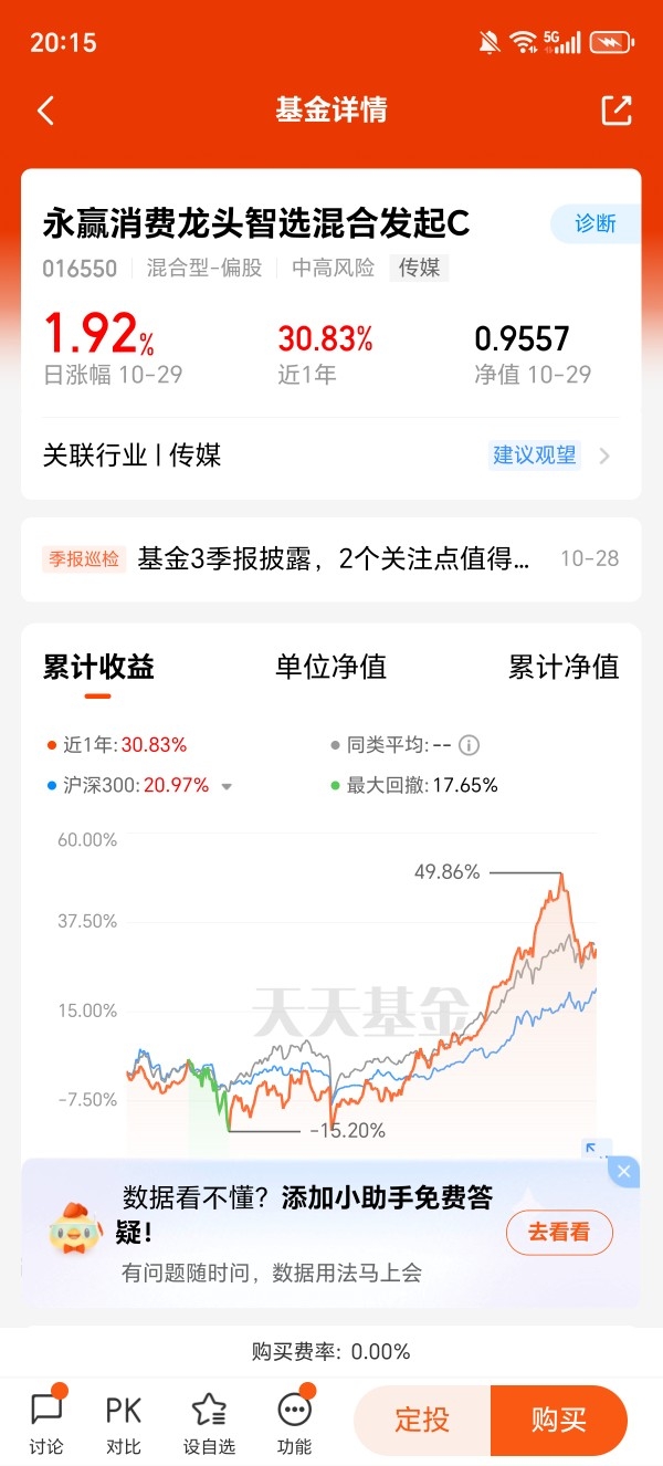 $永赢消费龙头智选混合发起C$ 今晚更新幅幅1.92%,近三个月涨幅18.40%,近六个月涨幅39.58%,近一年涨幅30.83%,各个阶段业绩稳定,行业估值处于历史低位。该基金聚焦传媒+教育双主线,基金经理通过精选高景气细分赛道,兼顾消费复苏与科技赋能,中长期更值得期待。#慢慢投基路 你悟出了哪些投资哲学?#
