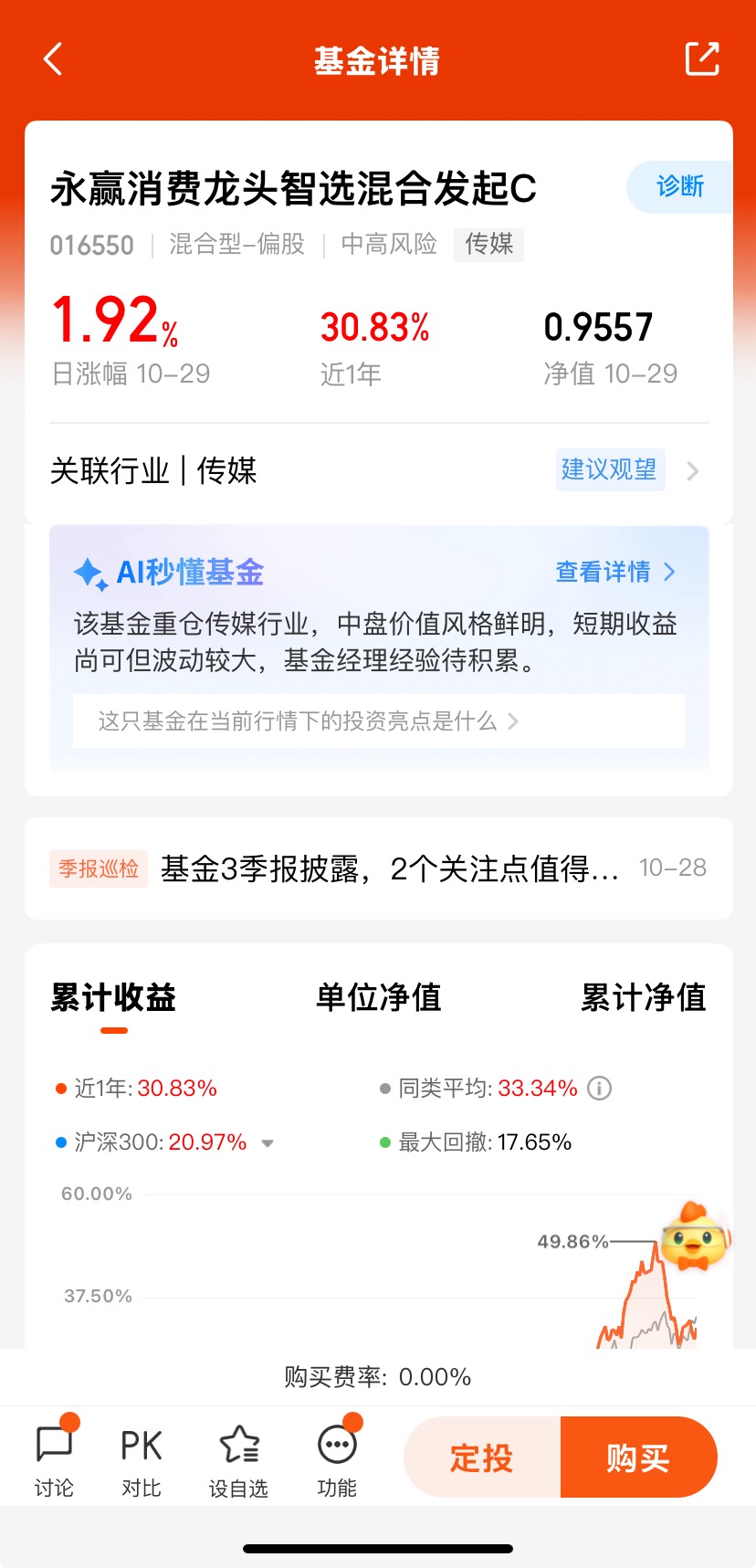 #飞天茅台批发价跌破1700!酒价何时触底?# $永赢消费龙头智选混合发起C$ 昨天上涨1.92%,近3月涨幅18.40%,近6月涨幅39.58%,整体业绩不错,该基金首先是精准布局AI传媒赛道,深度覆盖AI技术在内容生产、分发、消费等环节的应用;消费升级仍是主线,国货品牌、数字消费、健康消费、情绪消费等新兴领域有望持续增长;传统消费(如白酒、家电)在经济复苏和行业集中度提升的背景下,有望逐步企稳回升。