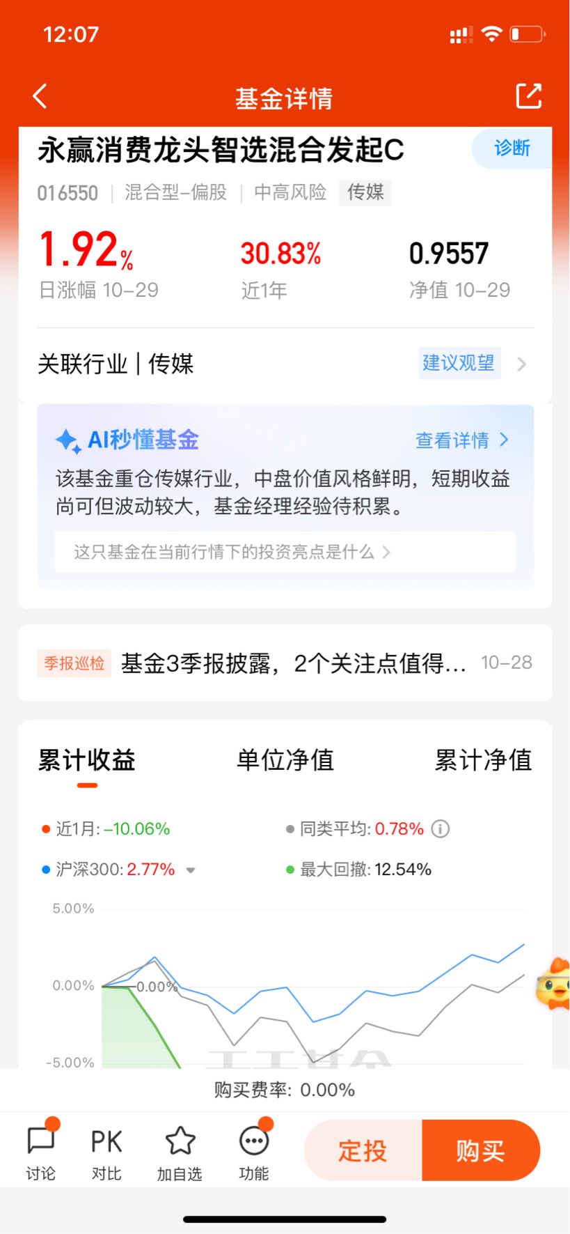 $永赢消费龙头智选混合发起C$ 昨天涨了1.92%,八天六涨,状态还是不错的!永赢消费龙头智选聚焦传媒与AI应用,也重点关注游戏板块,近半年39.58%涨幅,业绩表现也是不错的,目前赛道正处于高速发展阶段,板块成长空间广阔,趁着估值仍处于低位,值得继续期待了!