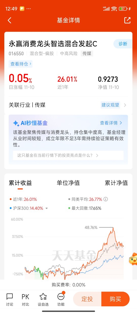 $永赢消费龙头智选混合发起C$昨晚飘红,近半年33.31%,近一年26.01%。