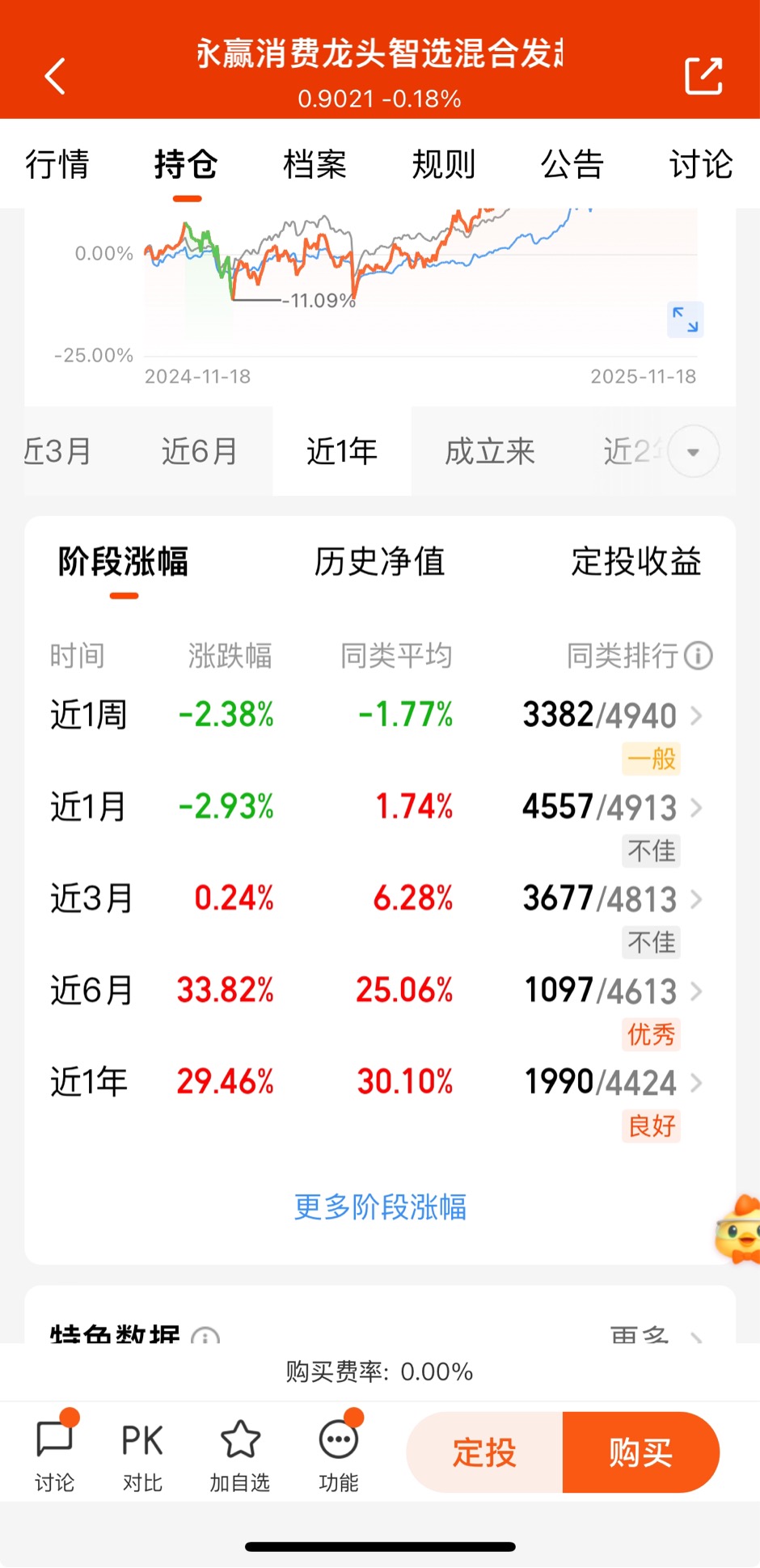 $永赢消费龙头智选混合发起C$趁调整的时候布局起来了,近6个月收33.82%,还