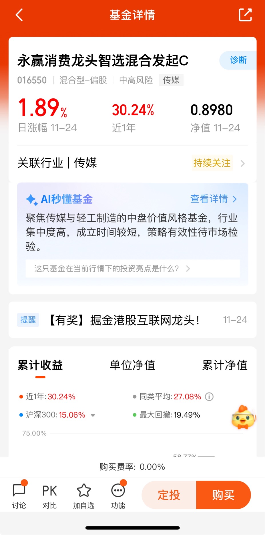$永赢消费龙头智选混合发起C$行情回暖了昨天收1.89%,近6个月收33.10%