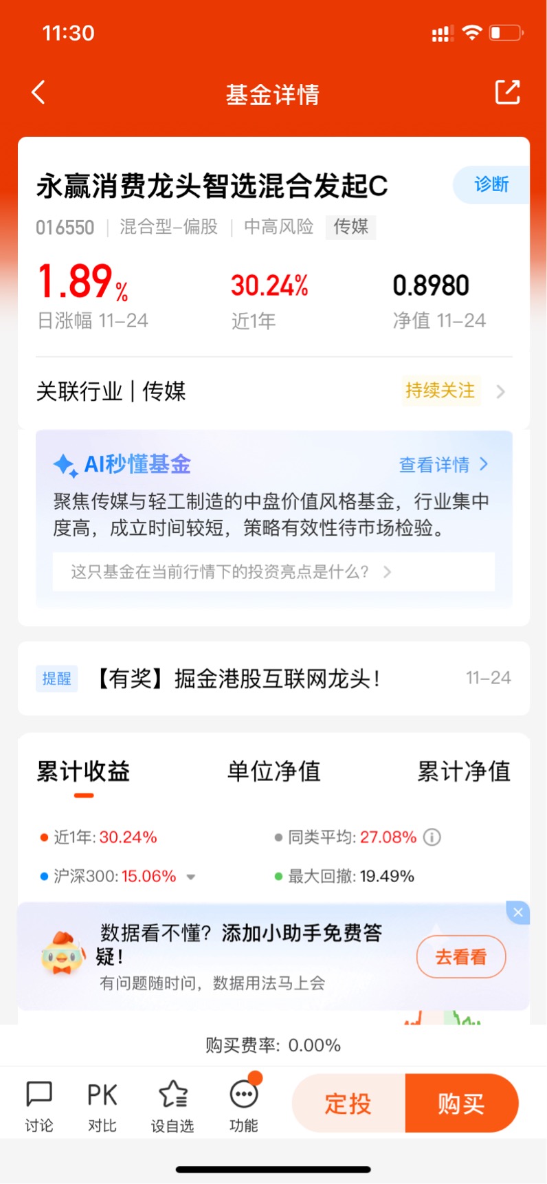 $永赢消费龙头智选混合发起C$ 昨天涨了1.89%,看目前的持仓股飘红的表现,涨势持续啊,是调整结束了么?永赢消费龙头智选聚焦传媒领域,重点关注游戏板块,行业正迎来双向共振,这里近半年涨超33%,短期业绩弹性还是很强的,远超同类平均表现,优秀的很,期待接下来更好的表现了!#今年买基金赚了多少钱?#