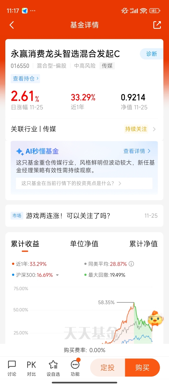 #流感药订单飙涨14倍 医药板块走强!# 行情回暖。风格明显的$永赢消费龙头智选混合发起C$ 昨晚大涨2.61%。连涨两天。近半年涨幅达到36.56%。基金聚焦传媒游戏赛道,以主动选股灵活布局巨人网络等龙头,业绩弹性突出。传媒游戏行业,AI赋能降本增效+出海收入增长,叠加新品管线丰富,板块估值业绩双升,成了核心发展的动力源!