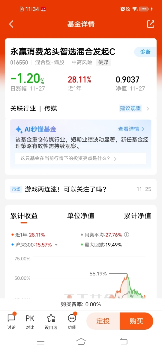 $永赢消费龙头智选混合发起C$ 趁着波动布局更有动力,近一周涨幅1.95%,近六个月涨幅31.62%,近一年涨幅28.11%,行业估值处于历史低位。聚焦游戏方向,游戏板块投资的优质工具,凭借其主动选股策略所具备的灵活特性,基金经理通过精选高景气细分赛道,中长期更值得期待。#3800点的A股值得加仓吗?#