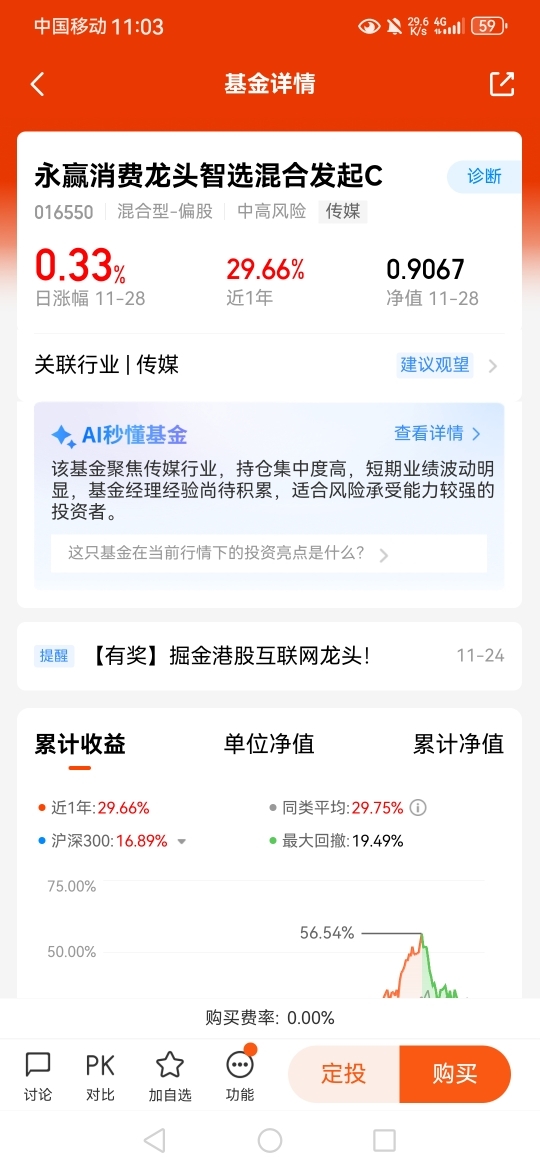 $永赢消费龙头智选混合发起C$ 聚焦AI 教育与传媒。整体估值偏低,投资性价比高,上周五上涨+0.33%;近一年涨幅+29.66%,AI科技发展,教育和传媒受益不错。将助力传媒行业重铸辉煌,传媒行业加速发展,政策利好共振下,布局高景气高成长赛道,现在开始着手布局明年行情也是不错的呀,有一起的小伙伴嘛。#12月基金投资策略#