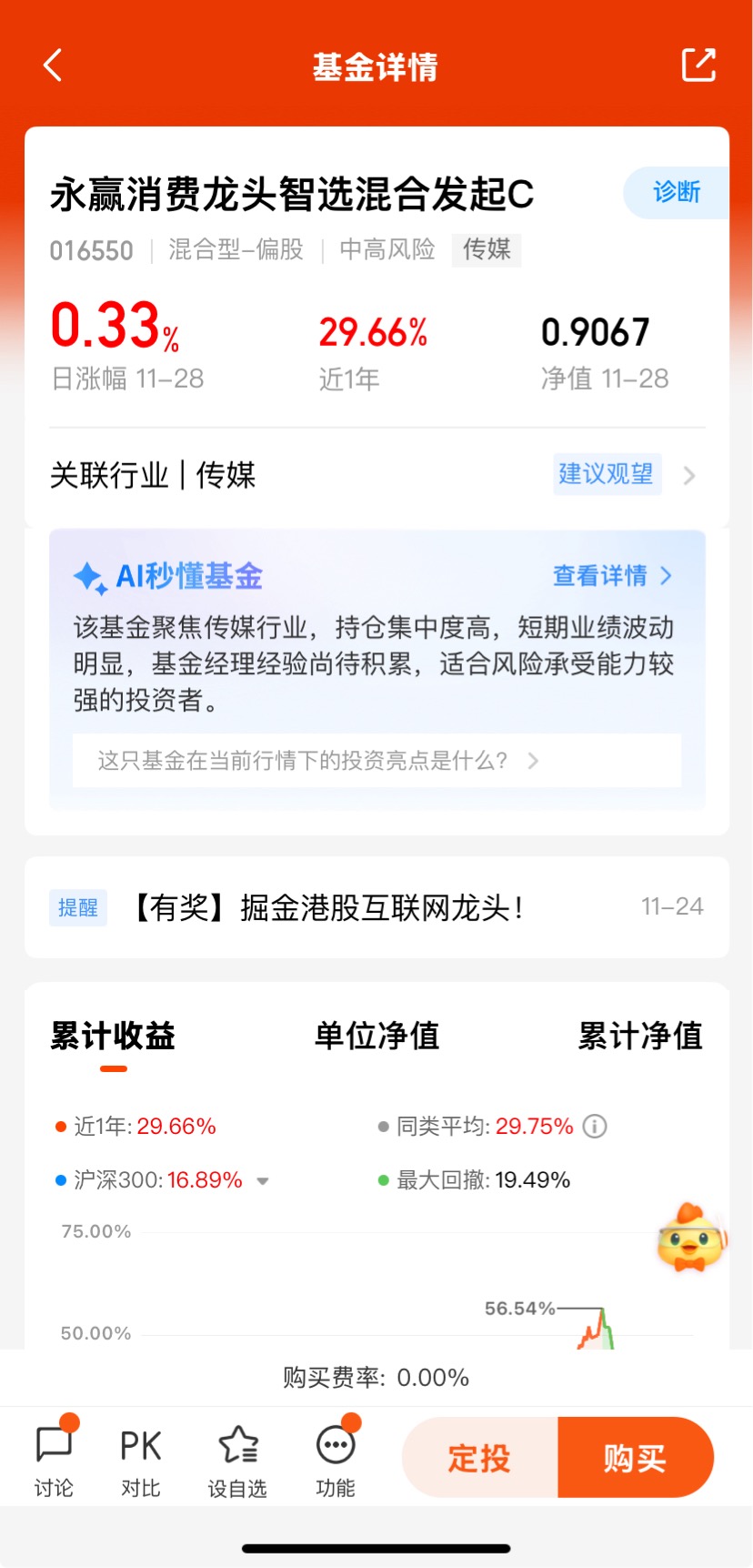 #11月我的投资总结!# $永赢消费龙头智选混合发起C$ 上一个交易日上涨0.33%,近6月涨幅32.40%,近一年收益29.66%;整体业绩不错,该基金聚焦AI传媒领域,重仓游戏、影视、图书等板块,受益于AI技术对传媒行业的推动,业绩增长显著。其优势在于精准定位AI传媒赛道,基金经理包恺任职以来表现突出,且持仓集中于行业龙头,能有效捕捉板块红利。消费板块短期受益于政策刺激和估值修复,长期在内需增长和消费升级的驱动下具备发展潜力。