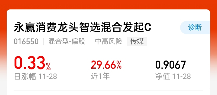 $永赢消费龙头智选混合发起C$今日表现很不错,前十大重仓股基本全红,它的持仓高度