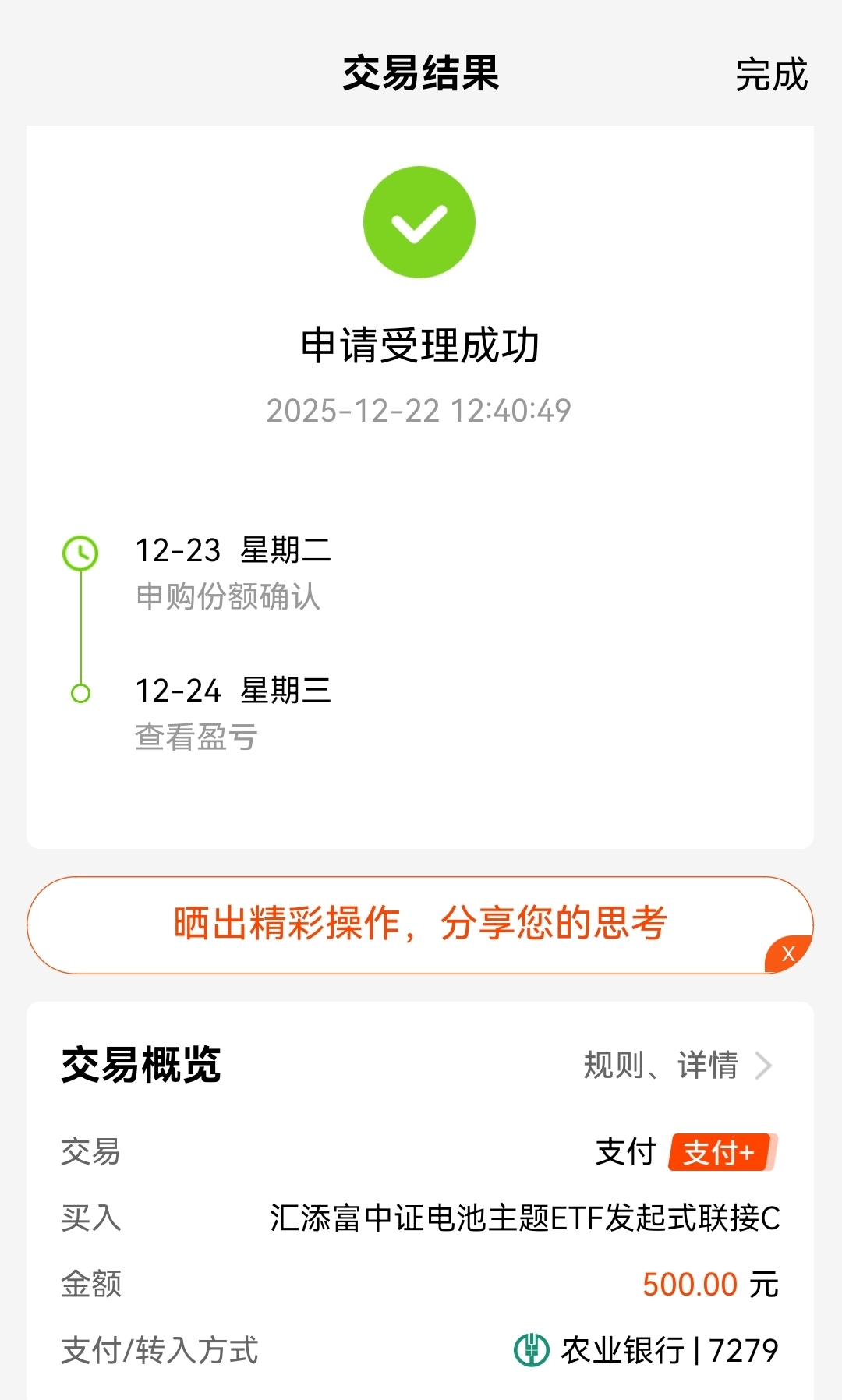电池板块作为近期热点方向,前面CPO等高位科技板块调整之际,电池作为资金避险替代,趋势走的较好,算是资金信仰之一,所谓强者恒强,我也先提前抢筹码,这支$汇添富中证电池主题ETF发起式联接C$ 我继续定投;
